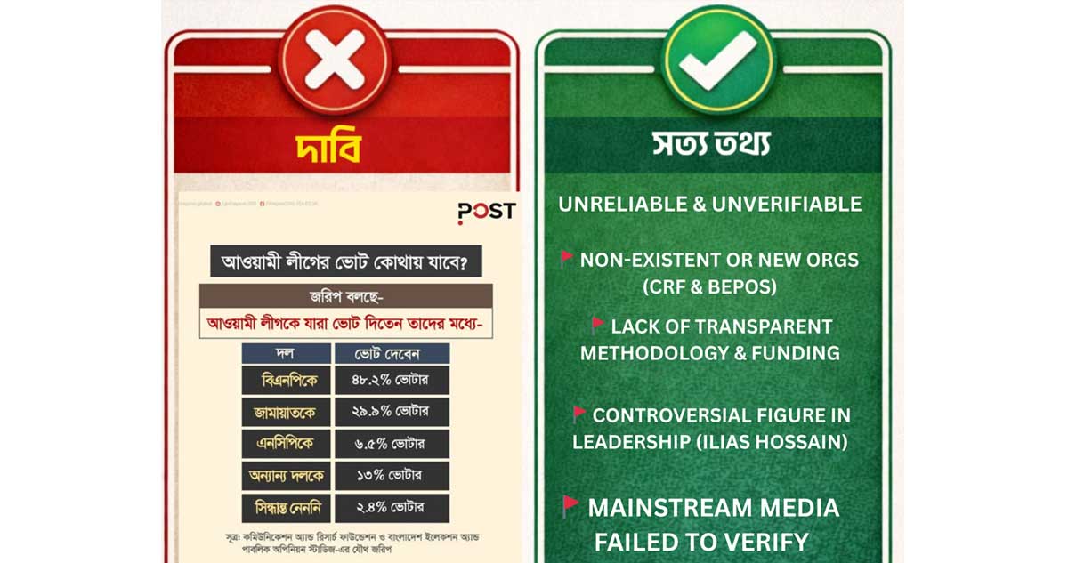 BEPOS: এই নামে কোনো স্বতন্ত্র ওয়েবসাইট বা নিবন্ধিত কোনো গবেষণা সংস্থার অস্তিত্ব অনলাইনে খুঁজে পাওয়া যায়নি। এটি শুধুমাত্র এই জরিপের জন্যই ব্যবহৃত একটি ‘শেল অর্গানাইজেশন’ হতে পারে বলে ধারণা করা হচ্ছে।