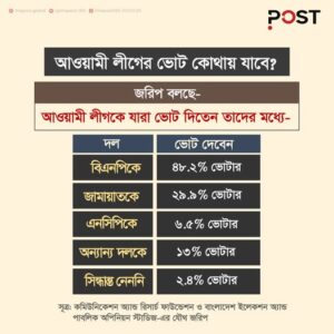 সম্প্রতি ‘কমিউনিকেশন অ্যান্ড রিসার্চ ফাউন্ডেশন’ (CRF) এবং ‘বাংলাদেশ ইলেকশন অ্যান্ড পাবলিক অপিনিয়ন স্টাডিজ’ (BEPOS) নামক দুটি সংস্থা “Uncovering the Public Pulse: A Nationwide Survey” শীর্ষক একটি জরিপ প্রকাশ করেছে। এতে দাবি করা হয়েছে, আওয়ামী লীগের ভোটারদের একটি বড় অংশ (৪৮.২%) এখন বিএনপিকে এবং ২৯.৯% জামায়াতকে ভোট দিতে চান। ১১,০৩৮ জন ভোটারের মতামতের ভিত্তিতে এই ফলাফল পাওয়া গেছে বলে সংবাদ সম্মেলনে জানানো হয়।
