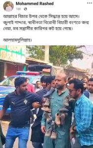 ফেসবুকে Mohammed Rashed নামের একজন এই ছবিটি শেয়ার দিয়ে লিখেছেন “আল্লাহর বিচার উপর থেকে সিদ্ধান্ত হয়ে আসে।জুলাই গাদ্দার, স্বাধীনতা বিরোধী বিহারী বংশতে জন্ম নেয়া, মব সন্ত্রাসীর কারিগর কট হয়ে গেছে।আলহামদুলিল্লাহ।” দেখুন এখানে