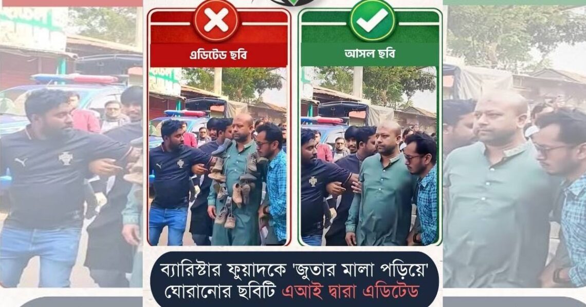 এবি পার্টির নেতা ব্যারিস্টার ফুয়াদকে গলায় ‘জুতার মালা’ পরিয়ে ঘোরানোর একটি ছবি সামাজিক মাধ্যমে ছড়িয়ে পড়েছে। তবে ফ্যাক্ট-চেক জোনের ফ্যাক্টচেকে দেখা যায়, প্রচারিত ছবিটি পুরনো আরেকটি ছবিকে এআই দিয়ে এডিট করে ভাইরাল ছবিটি তৈরী করা হয়েছে।