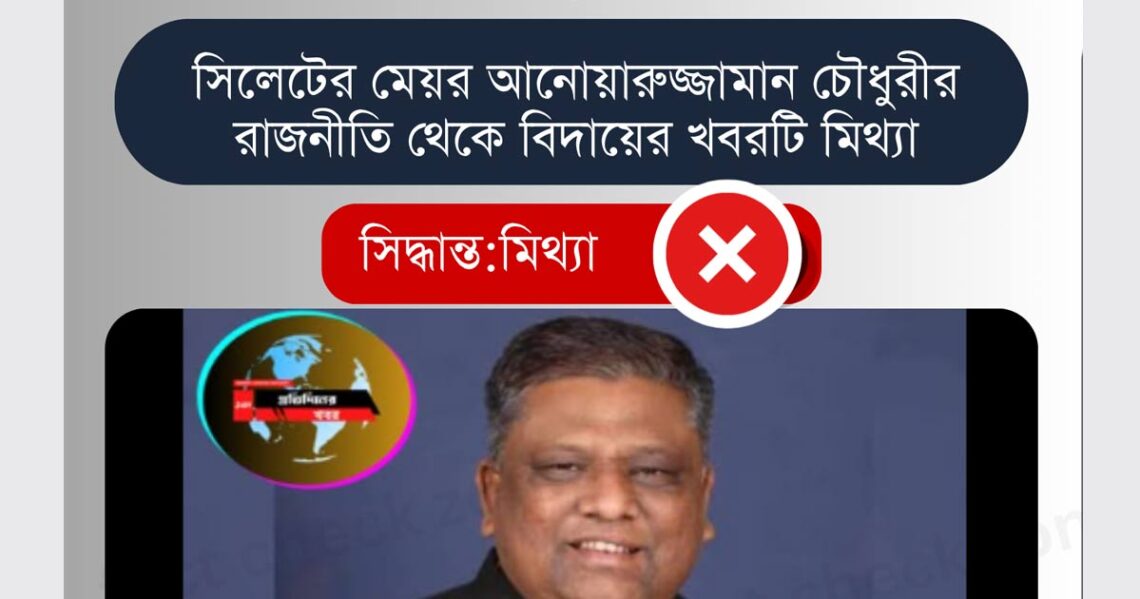 সিলেটের মেয়র আনোয়ারুজ্জামান চৌধুরীর রাজনীতি থেকে বিদায়ের খবরটি সম্পূর্ণ মিথ্যা ও উদ্দেশ্যপ্রণোদিত। রাজনৈতিক পটপরিবর্তন পরবর্তী অস্থিরতার সুযোগ নিয়ে জনমনে বিভ্রান্তি ছড়ানোর জন্য এই গুজব তৈরি করা হয়েছে। পাঠকদের প্রতি অনুরোধ, যাচাই না করে এ ধরণের গুজবে বিশ্বাস করবেন না।